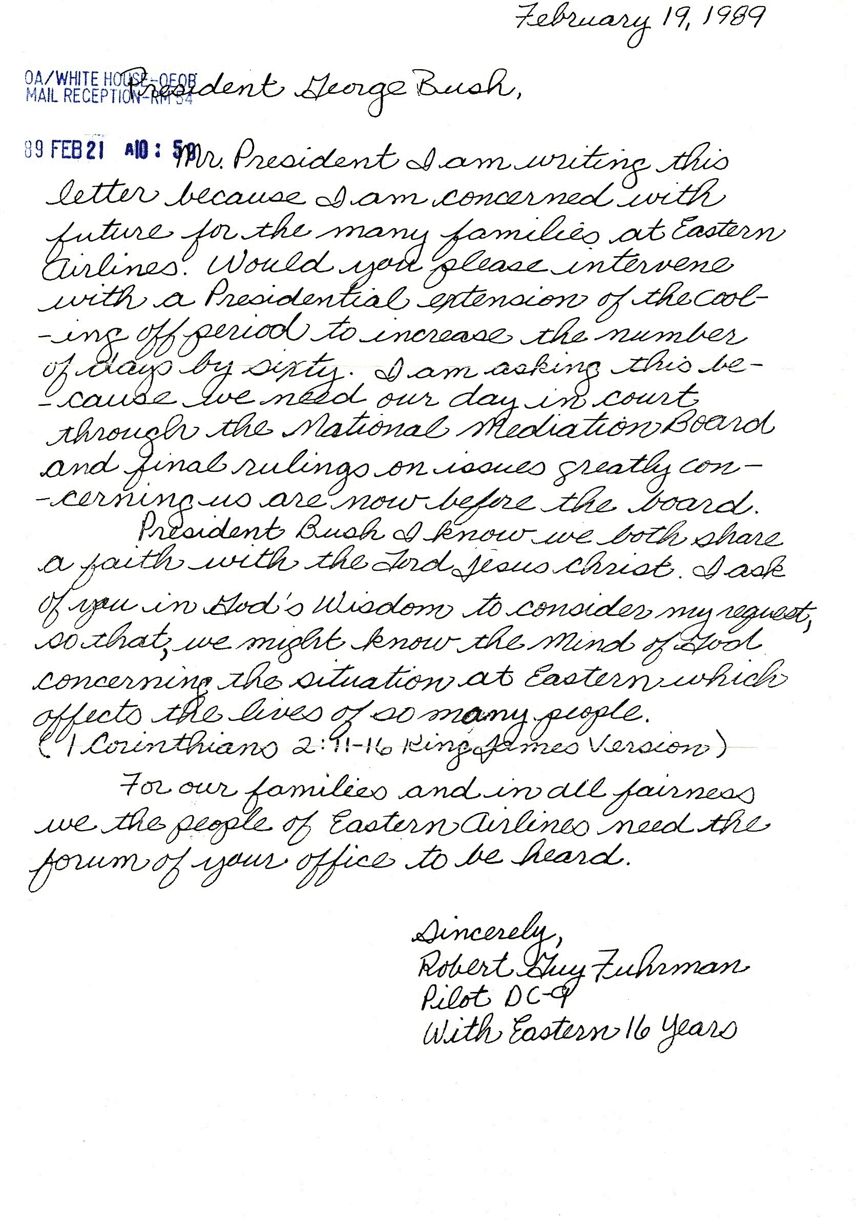 “The Seagull” My Letter To President H. W. Bush of February 19, 1989. Note the time stamp in the upper left hand corner. After writing this letter on the evening of February 19, 1989, in a Milwaukee hotel room, on the next day, February 20, 1989, as a co-pilot on my Eastern Flight 644, my assignment was changed to become a dead heading crew member. That is to say, to fly in the passenger cabin. The flight was supposed to go from Atlanta to Boston but we flag stopped Washington National Airport on our way to Boston. My seat assignment on this day of February 20, 1989, was on an Eastern Airlines Boeing 757, it was seat number 35F, and I was seated next to a lady who was a “White House Post Office Secretary”. I asked the White House Post Office Secretary, this wonderful lady, after showing and telling her about my letter that I had written to President H.W. Bush, written in a Milwaukee hotel room, on my layover the evening before, would she copy the original letter, time stamp the copied letter, and mail the timed stamped copy of this letter to my home. “She did”! “What a Kind Act of American Freedom”. As you are aware this story that you are reading now, about the Families of Eastern Airlines, would not have been written over these many years without this God Given Providential Experience that happened on Eastern Airlines Flight 644 on February 20, 1989. This letter to President H.W. Bush, “Our Seagull For The Families Of Eastern Airlines” flew to the White House without a Stamp or an Envelope.