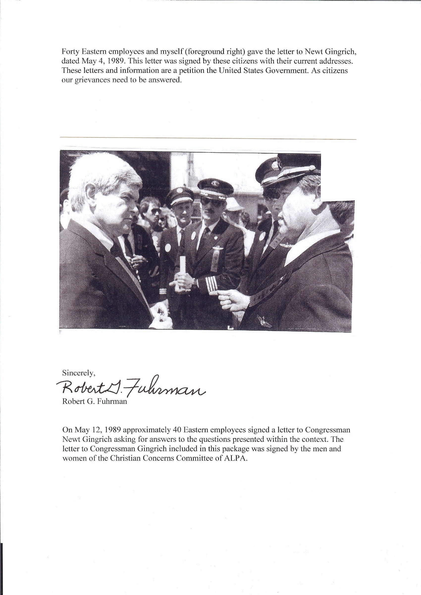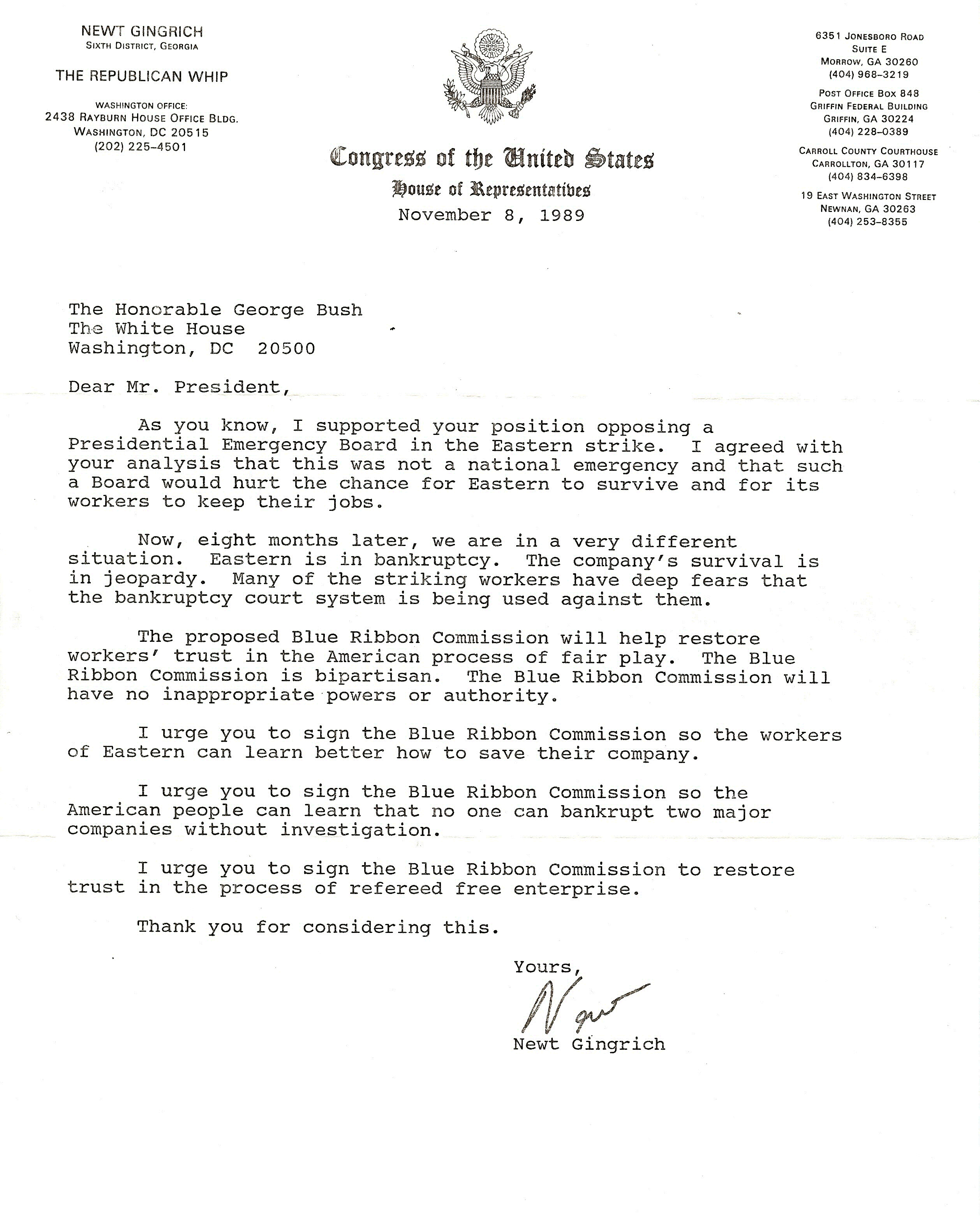October 28, 2014 In September of 1989 the “Employees Of Eastern Airlines” – “American People” – went to Washington D.C. to lobby our United States Senators for a bill, concerning the Eastern Airlines situation. Bill HR 1231 was to establish a “Blue Ribbon Commission”, two Republicans and two Democrats to hear our grievances, non binding to the President Of The United States. “To Have Our Voices Heard” as professional commercial airline personnel. I had the privilege to be among the 500 Eastern Employees that lobbied 93 U.S. Senators in 3 days, walking the streets of our nation’s capital, and traversing the corridors of our U.S. Senate Office Buildings. We did this in our Eastern Airlines Uniforms i.e. Ticket Agents, Flight Attendants, Dispatchers, Pilots, and Mechanics with our husbands, wives, and children in hand. Congressman Newt Gingrich wrote this letter below to President H.W. Bush to urge the President to sign this bill for our “Blue Ribbon Commission”.