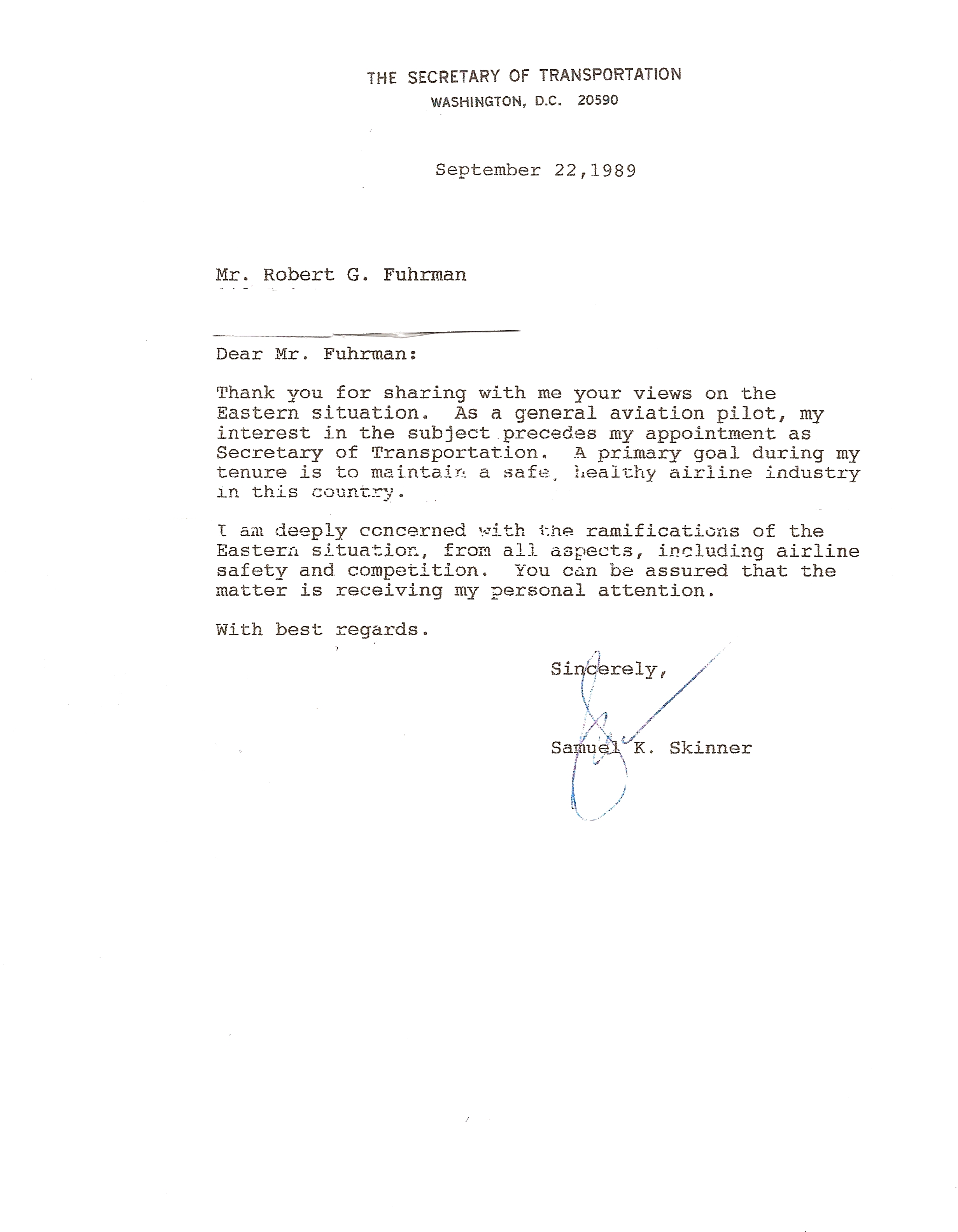 October 29, 2014 This letter from the United States Secretary of Transportation, Samuel Knox Skinner, came about because of Providence generated from Prayer. In our lobbing effort to pass HR 1231 we as people would pray together on the bus parked on the streets of Washington D.C. before we started on our lobbing efforts for the day. My friend and fellow Eastern Airlines pilot, Captain Virgil Tedder, prayed on our bus asking God to guide us this day and for our efforts to be successful, for God to guide us to the people we needed to see to be effective in our effort to pass HR 1231. As I departed from the bus I went around a corner on the sidewalk and encountered a limousine driver with the door of his limo partially in my path. I stopped and asked him who he was driving for, he said, “The Secretary of Transportation Samuel Knox Skinner.” Just at that moment the door of the building opened and I was surrounded by the secretary’s entourage and face to face with Secretary Skinner. I was able to express to him our concerns for “The Families Of Eastern Airlines” and gave to him our letters and correspondence. Secretary Skinner was very attentive and wished us well. He entered his limousine and as he departed he was reading my “February 19, 1989″ Letter to President H.W. Bush.