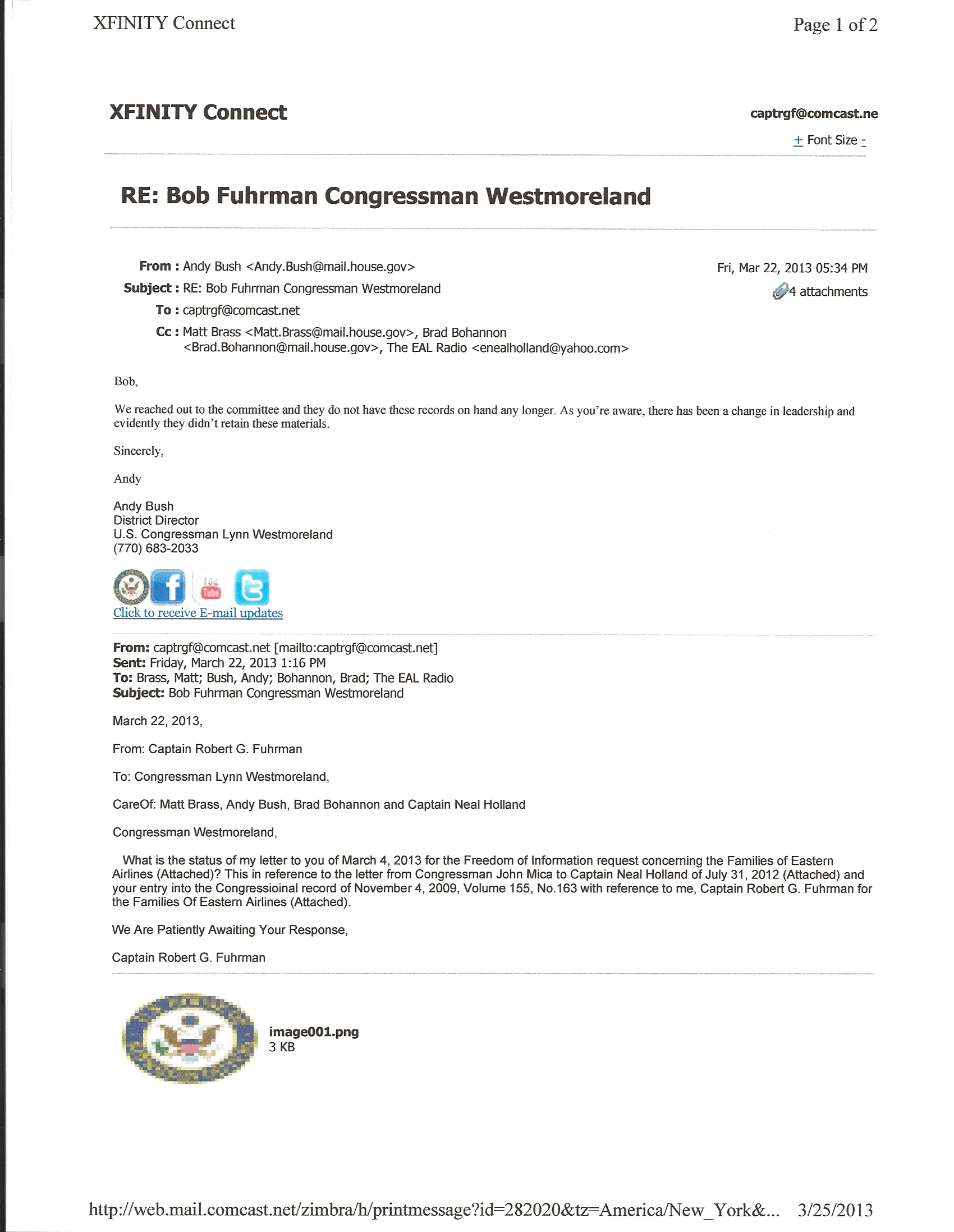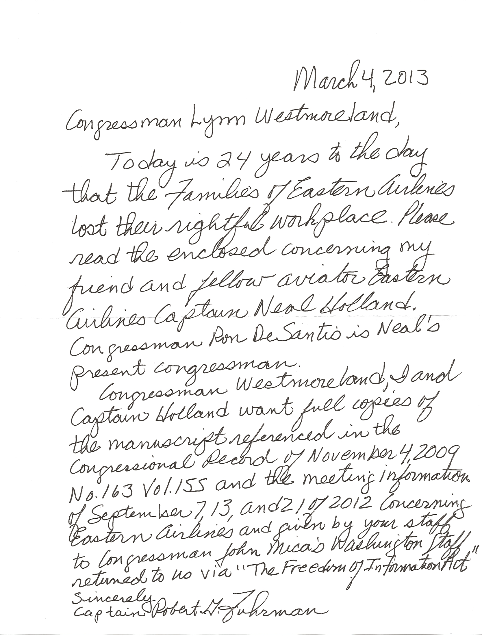 March 4, 2013 — 24 years from the date of the Eastern Airlines “Lockout” — As American citizens the “Families Of Eastern Airlines” have been denied the right to have our grievances brought forth before government committees to bring them into the light. Next is the email that Congressman Lynn Westmoreland’s Staff sent to me stating that our documents delineating these grievances could not be found. These documents are digitalized and can be easily duplicated. Note: The Constitution Of The United States was consummated on March 4, 1789, 200 years from the date of the “Lockout” at Eastern Airlines, March 4, 1989. Link to Congressman Westmoreland’s Congressional Record: