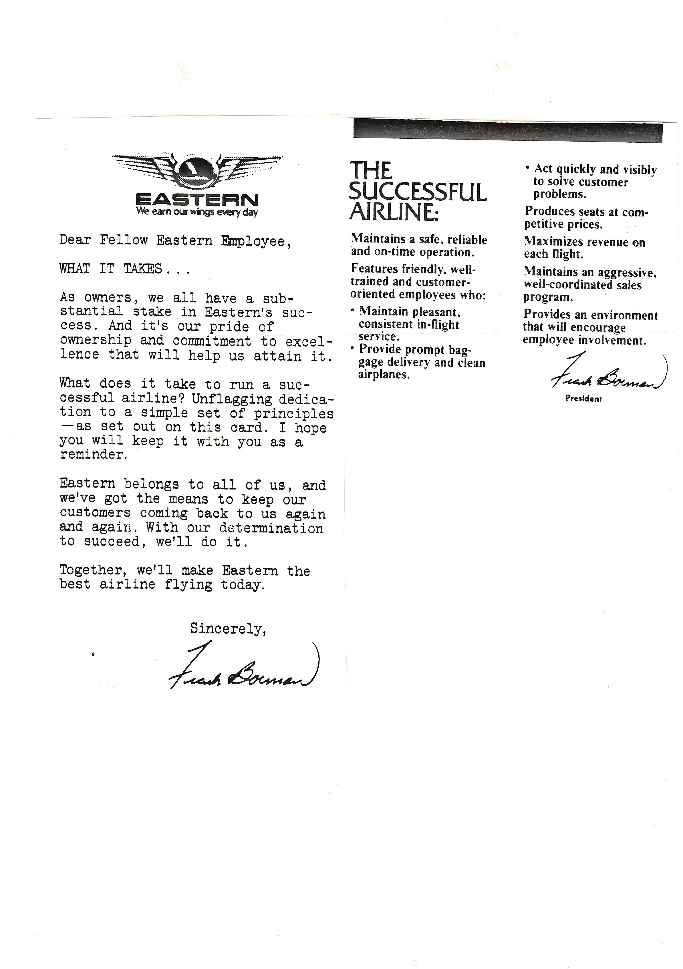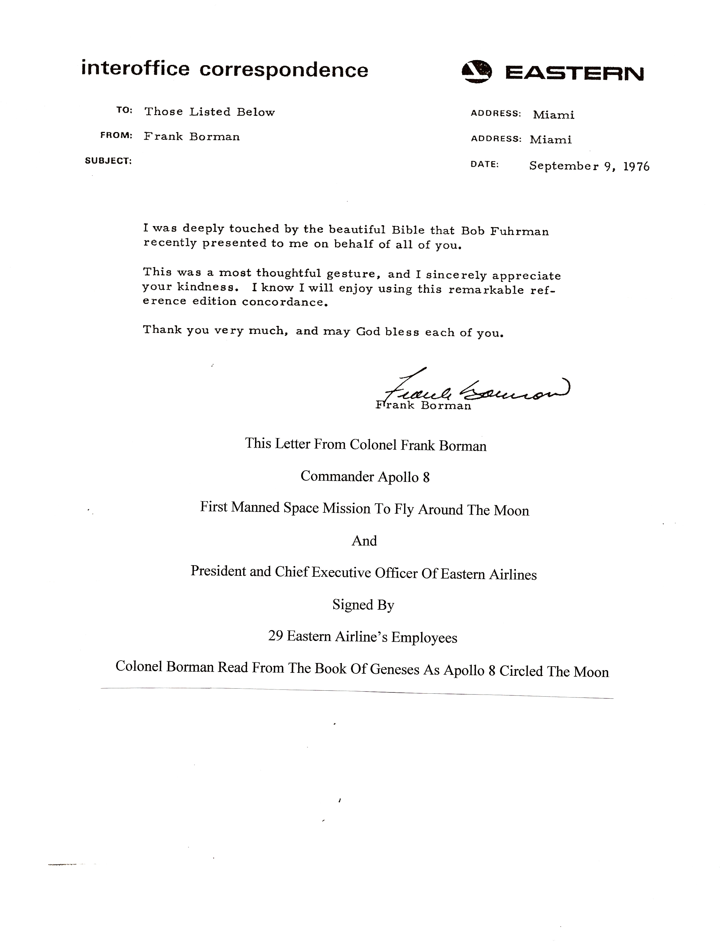 November 14, 2014 — In 1976 I was furloughed as a pilot from Eastern Airlines. During my time furloughed, from January of 1974 until July of 1978, I worked on the ground for Eastern in Detroit, Atlanta, and Miami. This gave me the opportunity to meet many of the employees of our airline and one of those individuals was Colonel Frank Borman. In the summer of 1976 I was in the Miami International Airport Terminal and Colonel Borman approached me in the concourse. I had met him before in Atlanta when he first came to Eastern Airlines as Vice President Of Flight Operations. He was now our President and Chief Executive Officer. I said hello and re-introduced myself. We had a conversation, as a furloughed pilot, I had learned things on the ground that I thought would be helpful in the daily operation of our airline. He said to me to call his office and make an appointment to see him personally. This I did and in the interim I had the idea to buy Colonel Borman a Bible. I thought it would be appropriate to have Eastern Airline’s Employees sign it in remembrance of his “Voyage Around The Moon” and following in the legacy of Captain Eddie Rickenbacker being “Lost At Sea”. The response from Colonel Borman to us as employees is below.