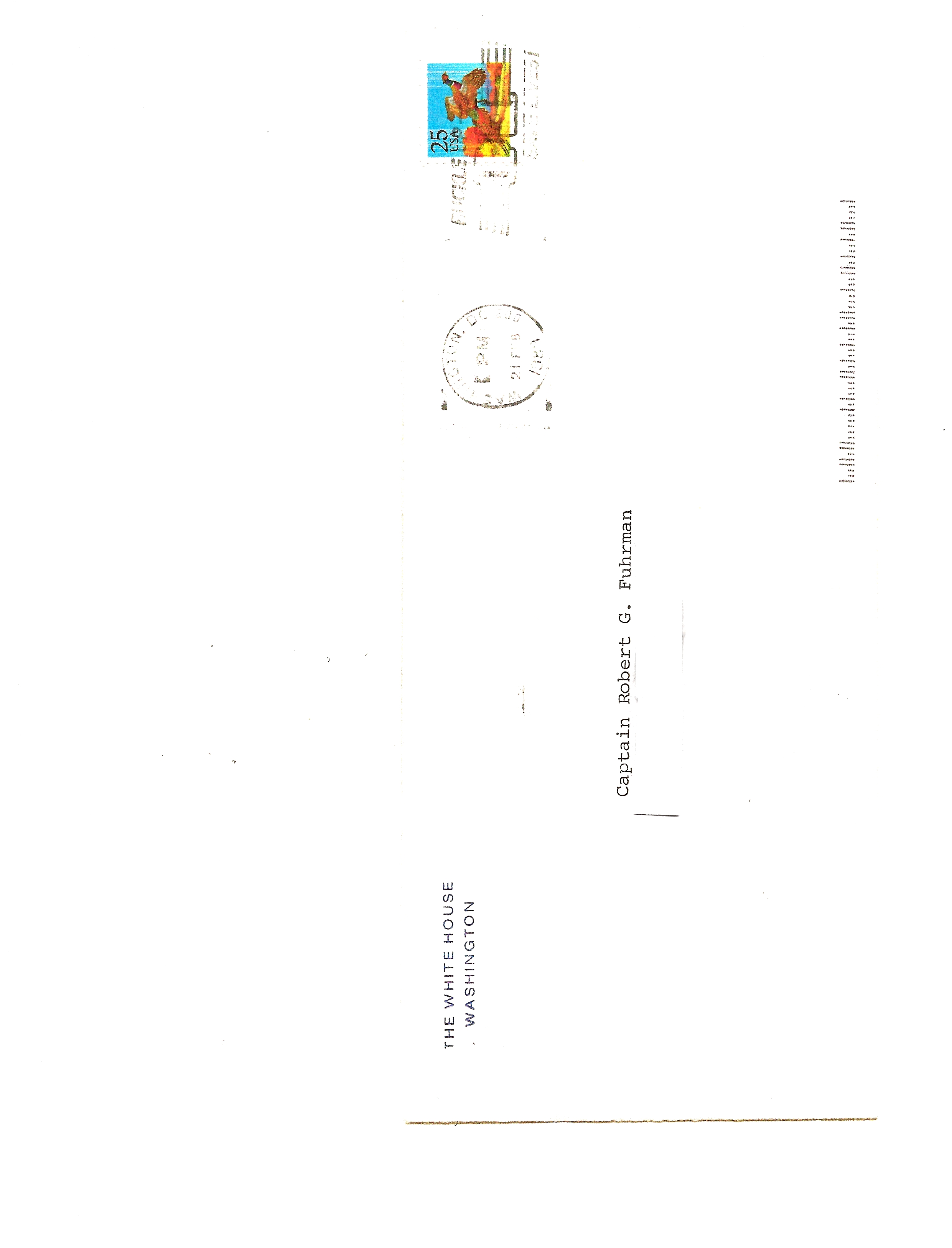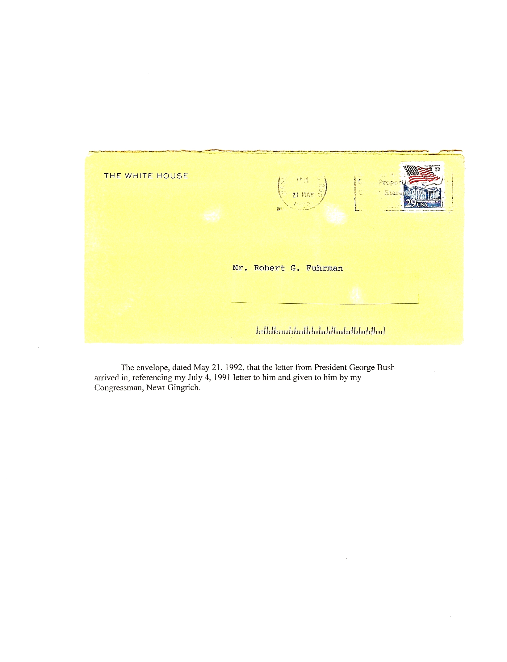 The White House Envelope that the Letter from President George H.W. Bush was mailed in to my home. Captain Robert G. Fuhrman