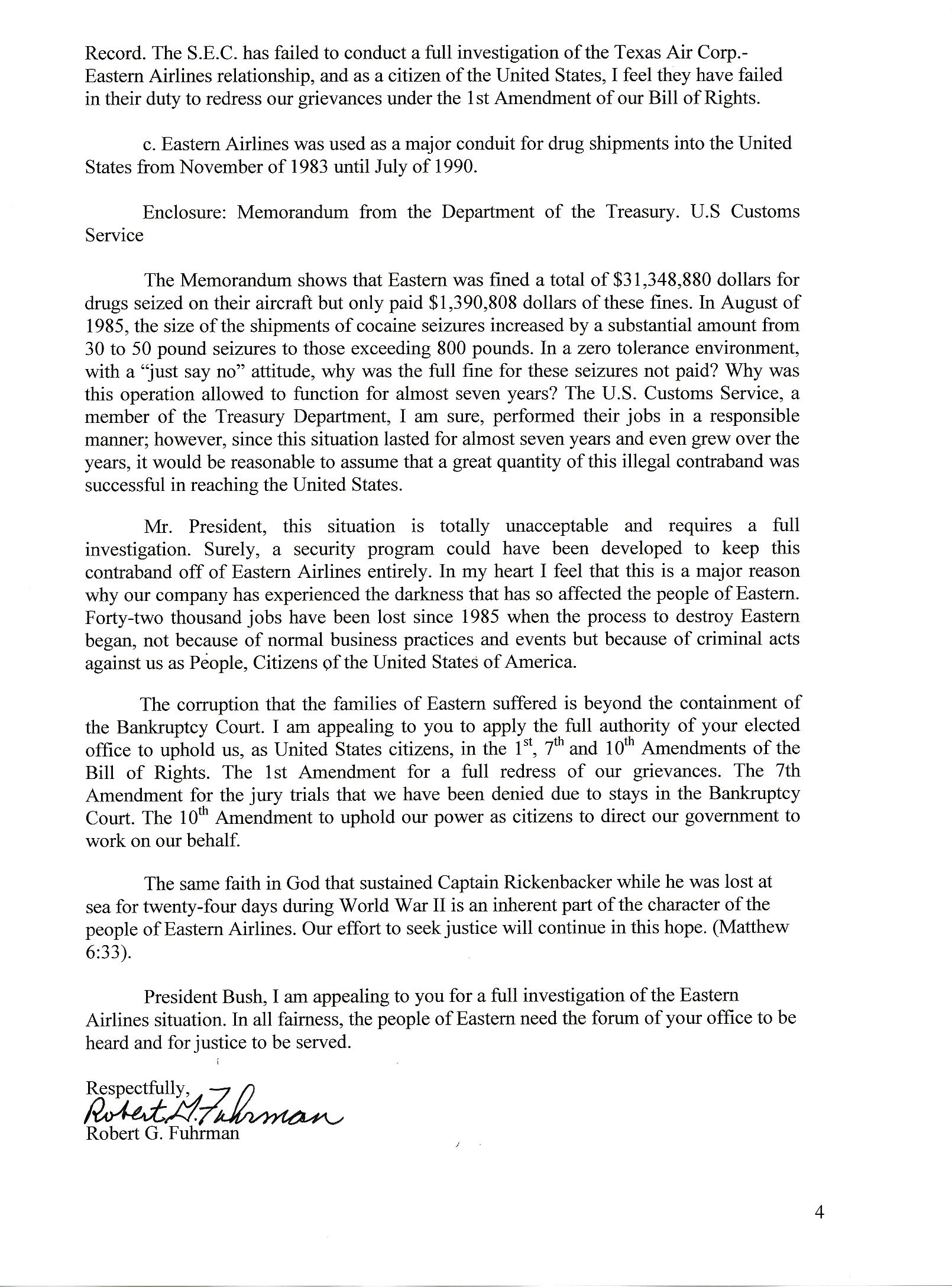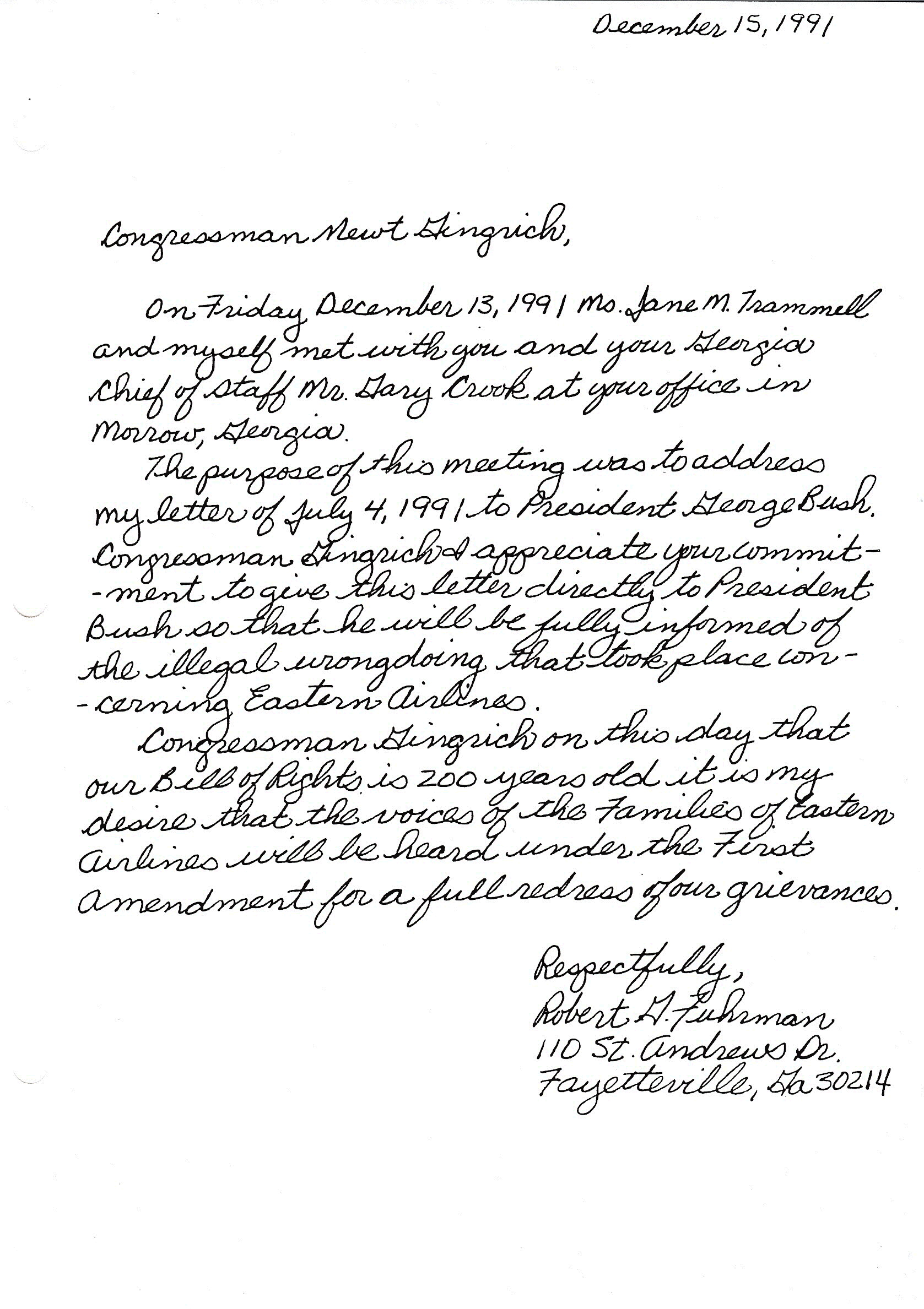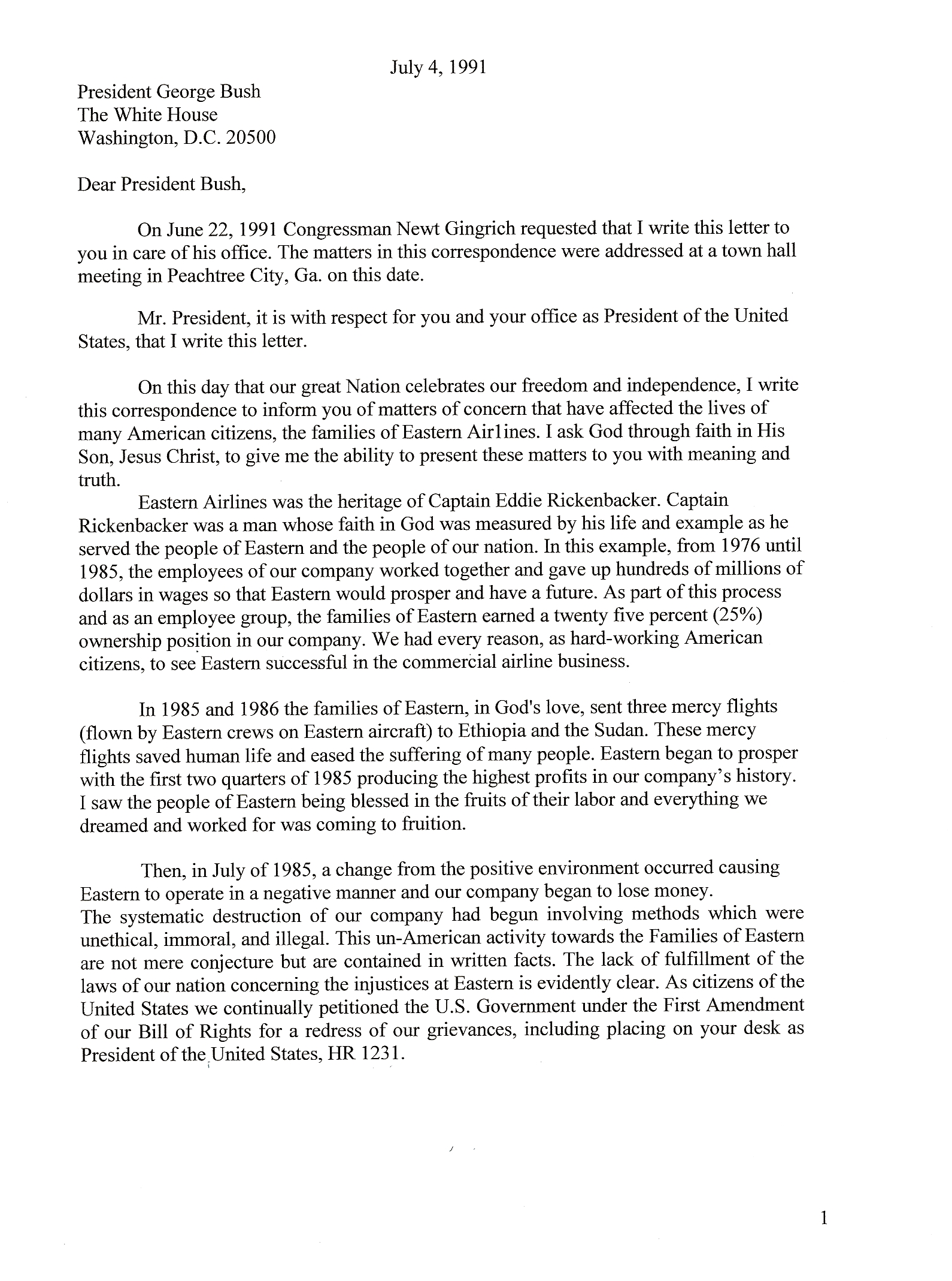 It was after the above Town Hall Meeting that my Congressman Newt Gingrich, in the presence of myself, Ms. Jane Trammell and one other Eastern family member, that Congressman Gingrich requested me to write a letter five pages or less stating the grievances for the “Families Of Eastern Airlines” that had had such a negative impact upon Our Families and he would personally give it to President H.W. Bush. My July 4, 1991 letter to President H.W. Bush was given to my Congressman Newt Gingrich’s Local Jonesboro, Georgia Office in the week of July 7, 1991. Captain Bobby Fuhrman