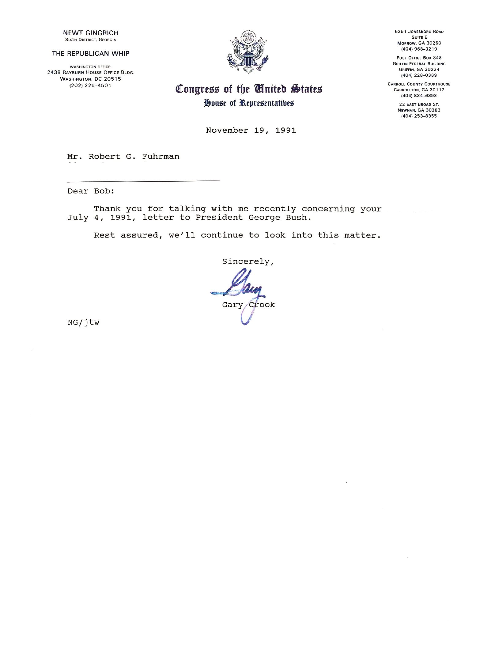 Congressman Newt Gingrich’s First Letter November 19, 1991 Concerning My July 4, 1991 Letter To President George H.W. Bush