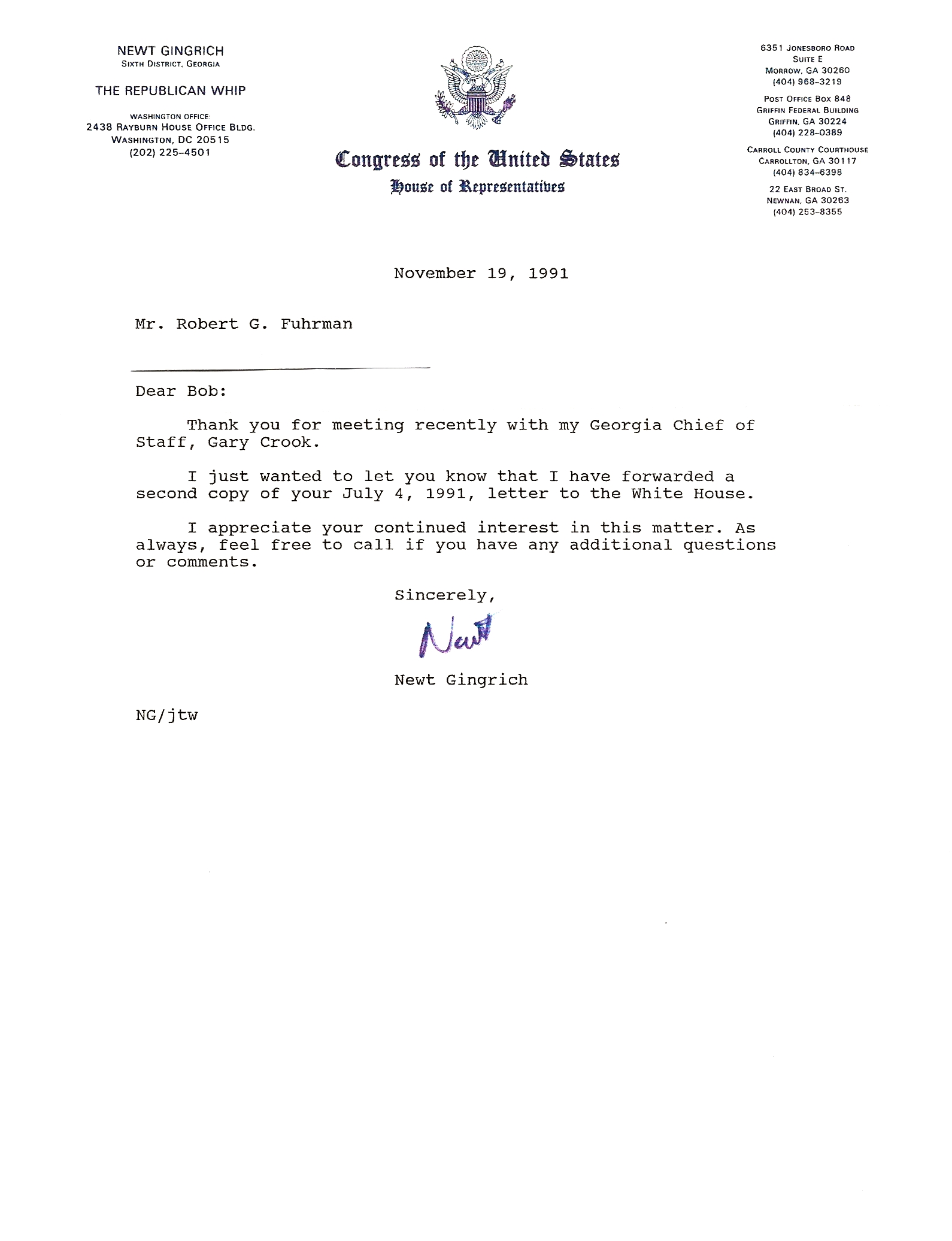 Letter To Congressman Newt Gingrich From myself and Ms. Jane Trammell after an personal meeting with Newt in his Local Congressional Office in Morrow, Georgia December 15, 1991