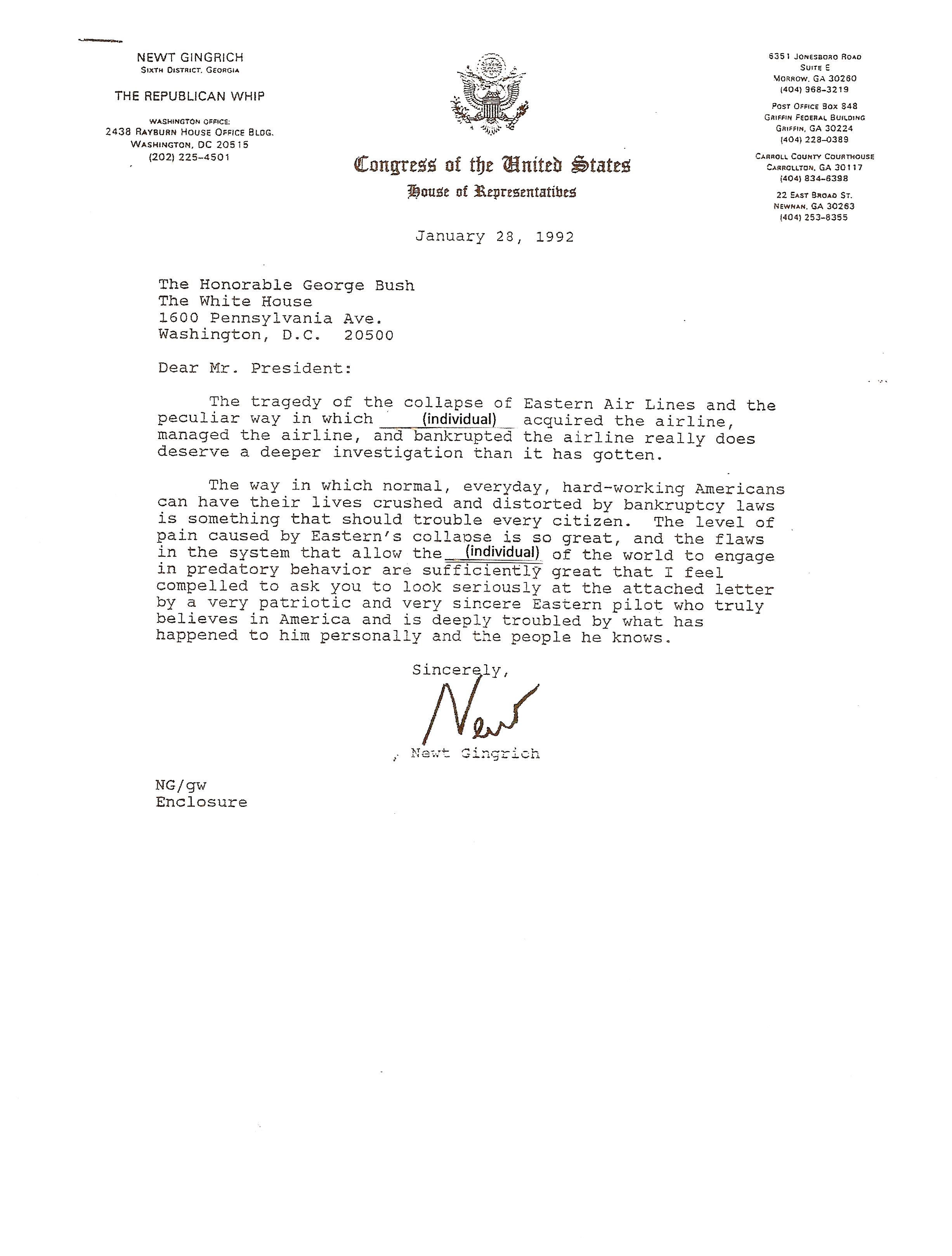 Congressman Gingrich’s Letter to President George H.W. Bush January 28, 1992 concerning my July 4, 1991 letter.