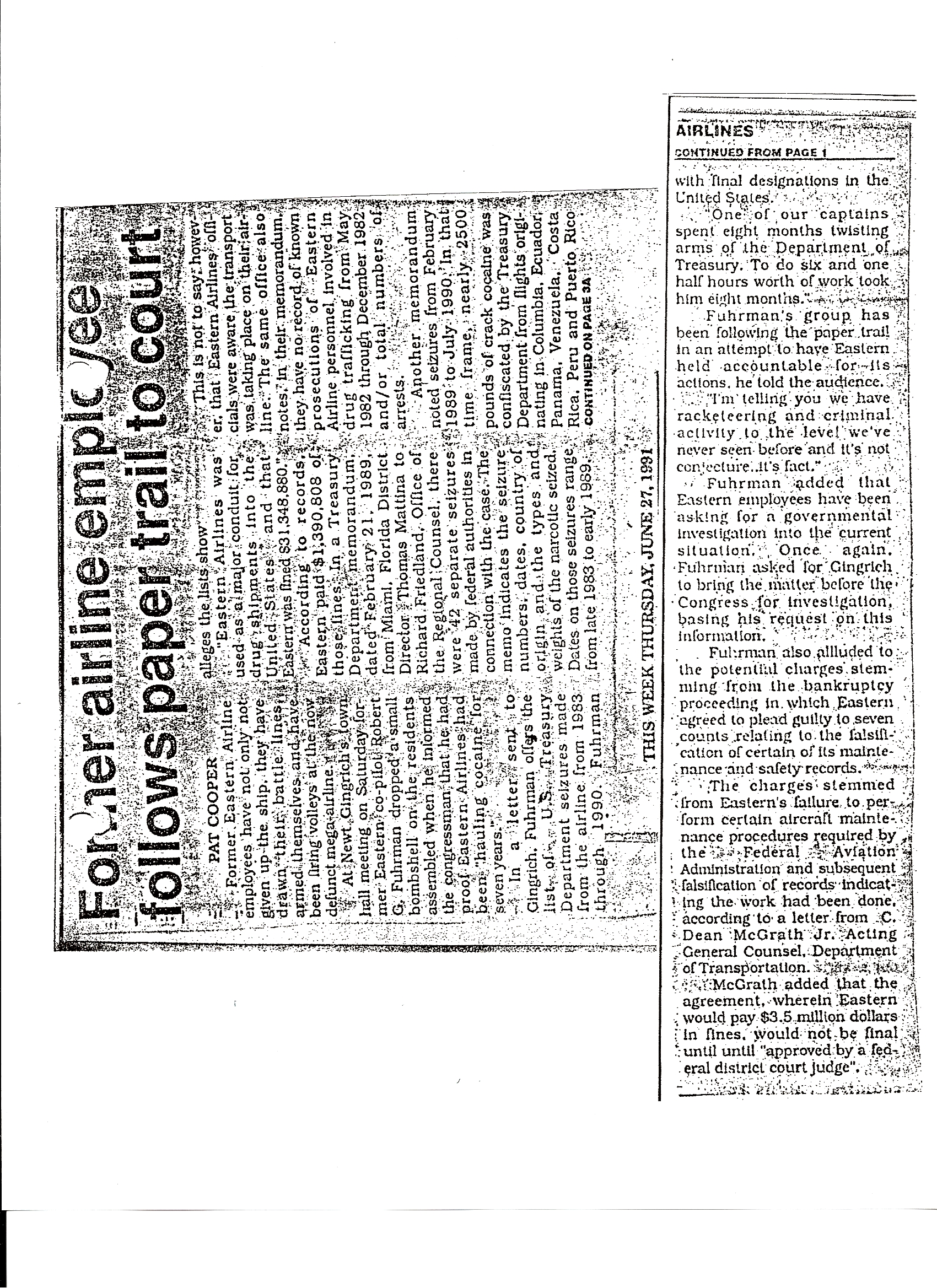 November 15, 2014 — Below is the news paper article of June 27, 1991 that is the public documentation of the Town Hall meeting with Congressman Newt Gingrich in which grievances of the Families Of Eastern Airlines were expressed in the freedom of the 1st Amendment in the exercise of our rights as free people using the Freedom Of The Press. This is the basis for two of the three grievances that I expressed concerning Eastern Airlines and our right, as employees, as American Citizens, to have a safe working environment, with respect, integrity, and responsibility.