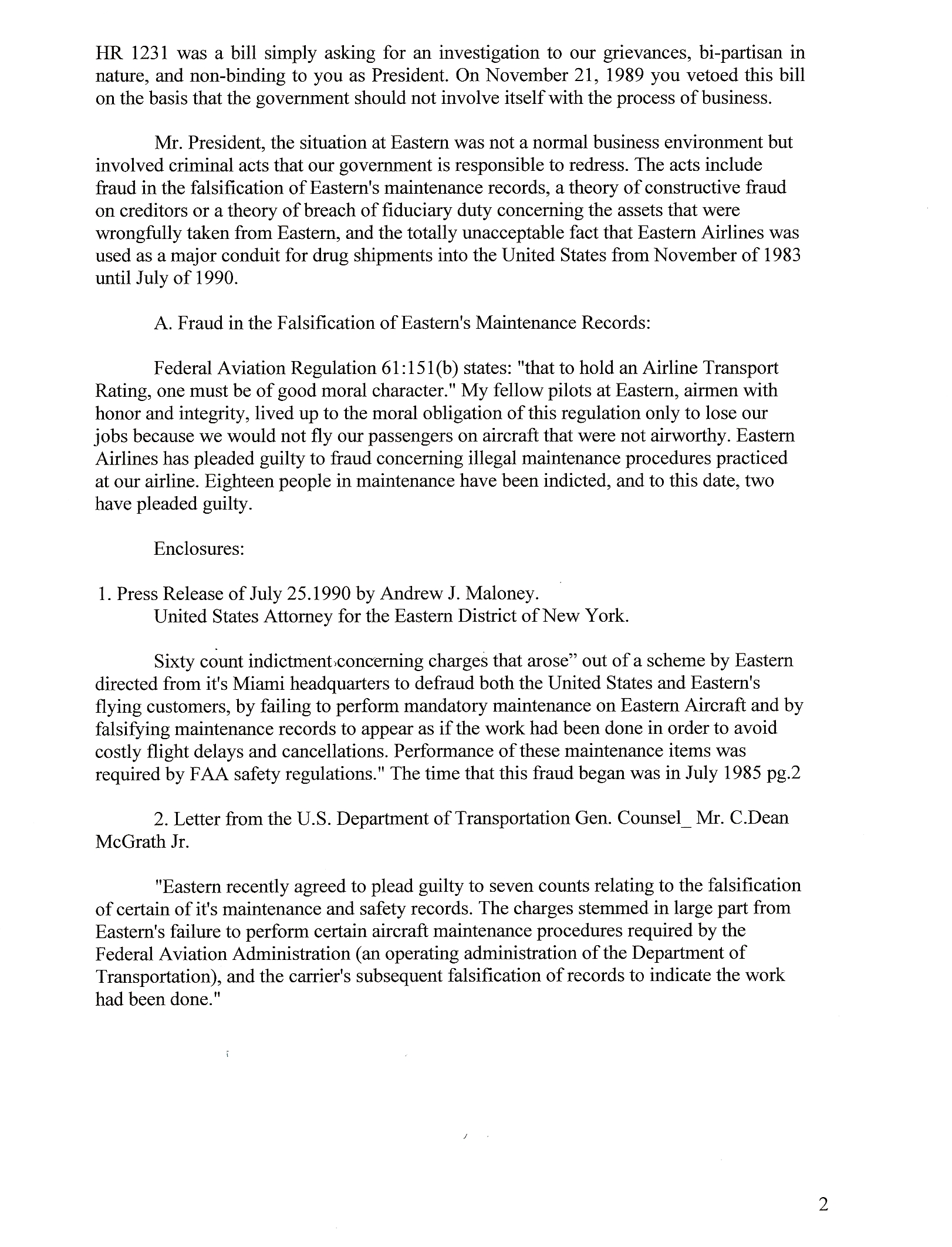 Three Grievances are stated in my July 4, 1991 letter to President H.W. Bush as part the “Manuscript” in the Congressional Record November 4, 2009, Vol. 155, Washington, Wednesday, No. 163 House Of Representatives History Of Eastern Airlines Speech Of Hon. Lynn A. Westmoreland Of Georgia. The link to the Congressional Record Page referenced above is below: