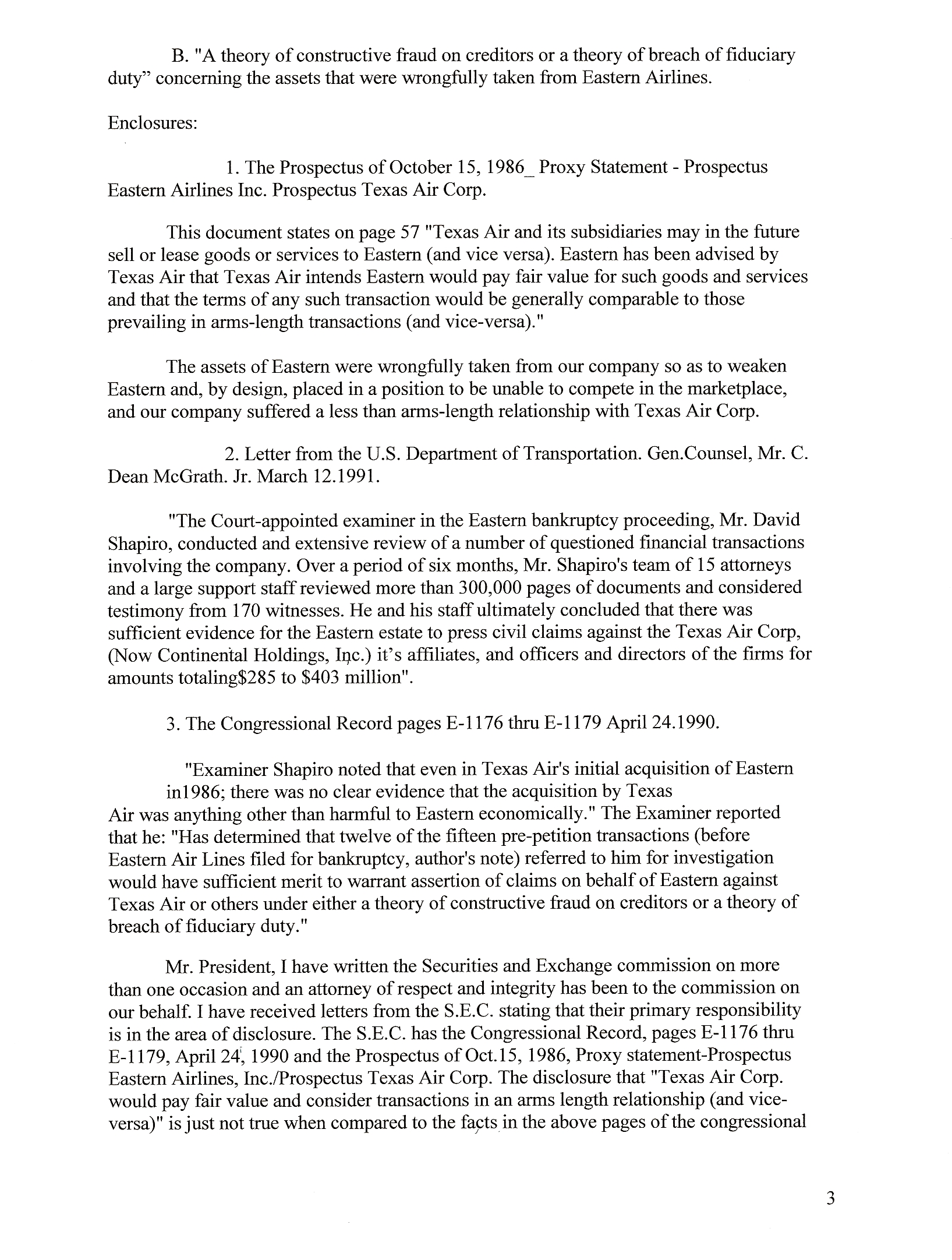 The third grievance that is of concern to the “Families of Eastern Airlines” is the asset stripping of our publicly traded corporation of which as an employee group we collectively owned 25 present of the common stock prior the sale of Eastern in January of 1986. The Bankruptcy Court Appointed Examiner, Mr. David Shapiro, completed a financial report concerning Eastern Airlines for the court in 1990. The Shapiro Report was some 150 pages. I requested my Congressman Newt Gingrich to enter this report into the Congressional Record. Congressman Gingrich asked me to condense this report to 15 pages or less because of printing cost considerations. I complied with Newt’s request condensing the Shapiro Report to fifteen type written pages which transposed to four pages in the Congressional Record. These four pages are in the Congressional Record, Hon. Newt Gingrich, in the House Of Representatives, Tuesday, April 24, 1990, Pages E-1176 thru E-1179. The link to the Eastern Airlines Congressional Record Shaprio Report is below: