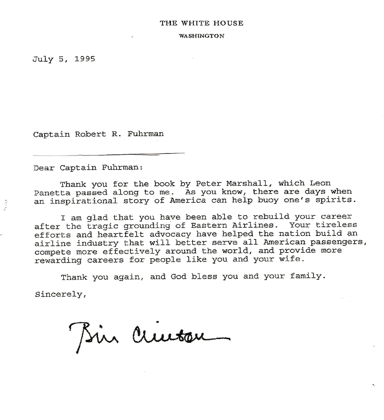 The Eastern Airlines saga is and has been a constant ongoing process to have the “Voices Of The Families Of Eastern Airlines” heard. My former Congressman Mac Collins, whom I first met in my church when he was then a Representative in the House of Representatives in the State Of Georgia, took me to a meeting in the White House in the “Old Executive Office Building”. I was able in this meeting with Congressman Collins and President Clinton’s staff member, a member of the National Economic Council to his administration, to make known our grievances of the “Families Of Eastern Airlines”. In this meeting, I had the privilege to present to President Clinton’s staff member a copy of Peter Marshall’s book “The Light and the Glory”. “The Light and the Glory” exemplifies the history of Christ in America from Christopher Columbus to the Inauguration of President George Washington. Below is the response to me from President Bill Clinton.