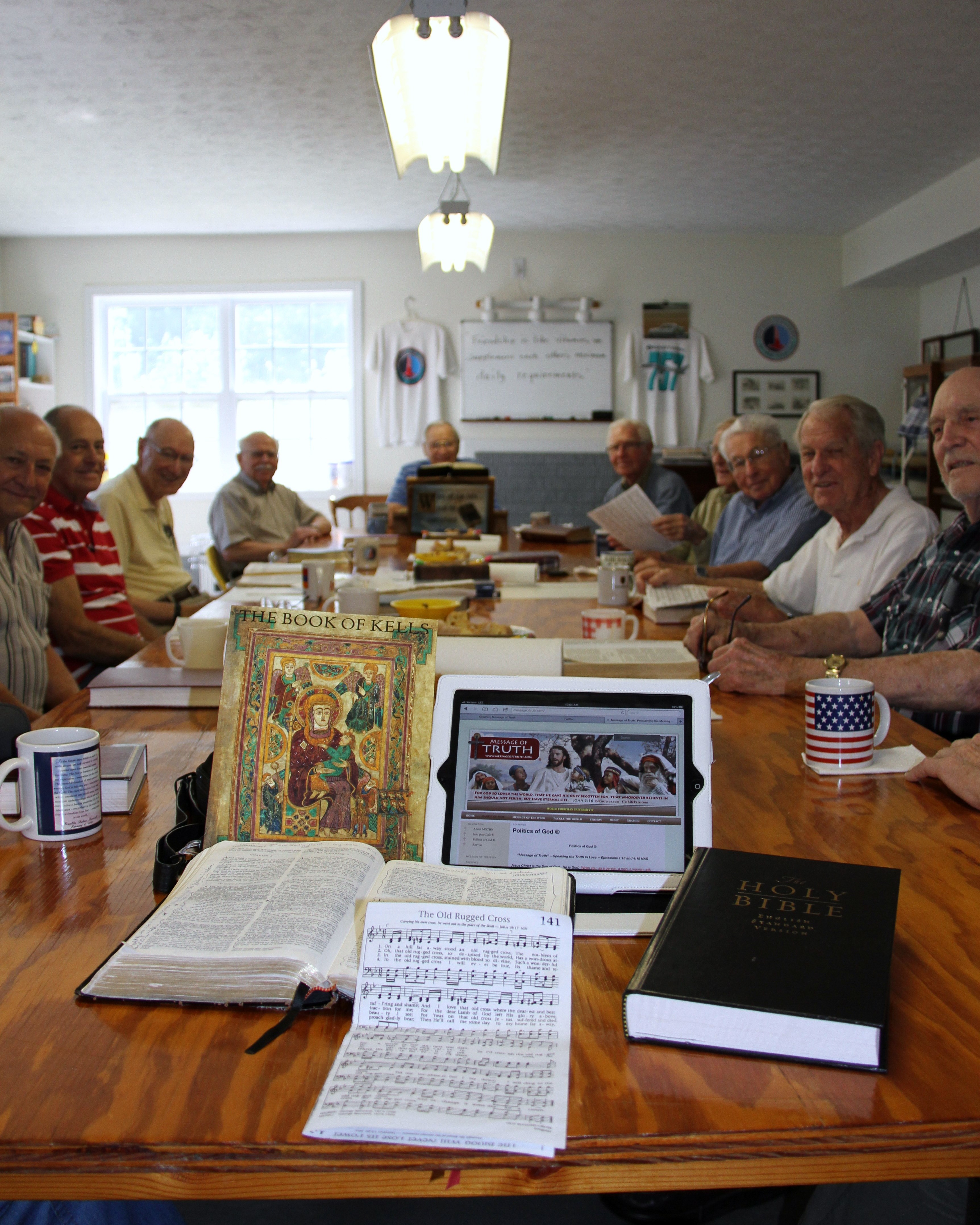 Below is the Prayer Group that I have attended for over fifteen years. These are men mostly comprised of Eastern Airline’s Pilots and Employees. They are the men of World War II. “Men of Valor” Reverence and Creditability for www.BoGoJesus.com from this mens prayer group on March 7, 2013. The scripture verses, James 2:18-19, for our bible study this day, were on the white note board on the wall at the end of this table.