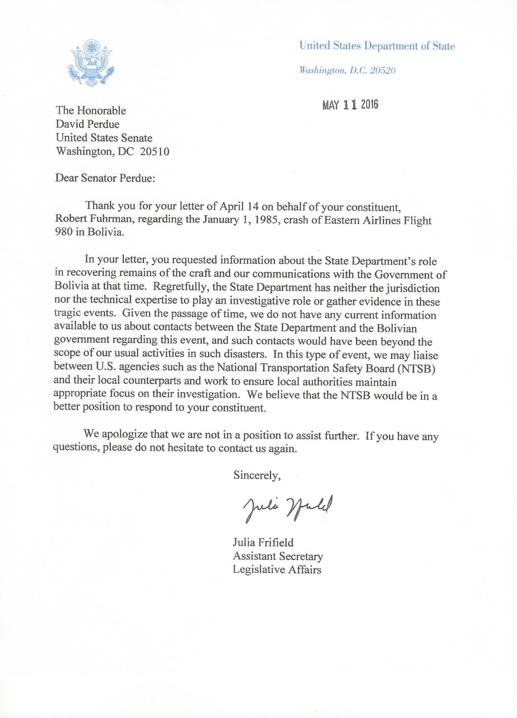 May 11, 2016 Letter from Ms. Julia Frifield Assistant Secretary Legislative Affairs United States State Department to Senator David Perdue.