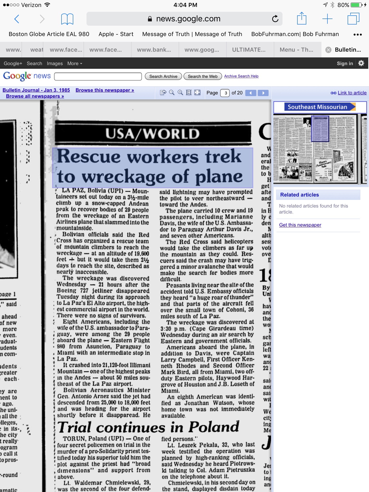 New York Time Report of Eastern Airlines Crash 980 on January 1, 1985, link below. There are interested people that have asked the NTSB about information concerning the crash of Eastern Airlines 980 for many years and the NTSB responds that there is no record of this crash; as I have related to you as my elected representatives in my correspondence. So if while reinvestigating the Buddy Holly crash, which is good to do so, can the NTSB go to Mount Illimani and conduct a real investigation of the crash of Eastern Airlines 980? Remember Mrs. Judith Kelly walked to the crash site of Eastern Airlines Flight 980, in July of 1985, on her own, to be with her deceased husband, Mr. William Kelly, the Peace Corp Director of Paraguay. The NTSB arrived at the crash site four months later in October of 1985 for a very short time at the crash site. Why this conduct by our trusted federal investigators?