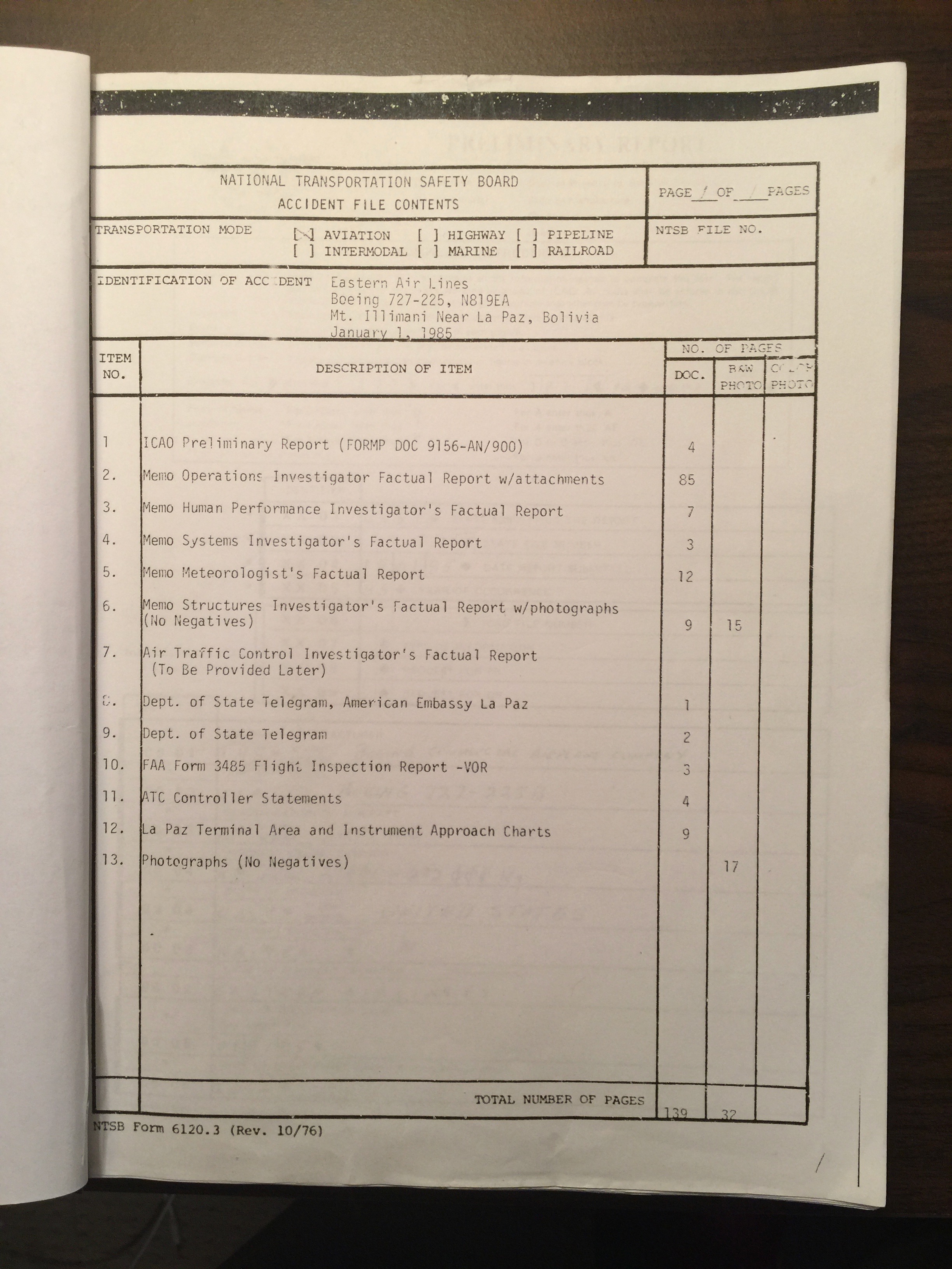 Mr. Gregory A Feith was the National Transportation Safety Board’s Air Safety Investigator for the Crash of Eastern Airlines Flight 980. Air Safety Investigator Gregory A. Feith “On September 25, 1985, I was selected to retrieve the cockpit voice recorder and the flight data recorder from the Eastern Airlines Boeing 727 that crashed on January 1, 1985 at 19,600 foot level of Mount Illimani, located near La Paz Bolivia”. The National Transportation Safety Board Eastern Airlines Flight 980 Investigative Team first met on October 1, 1985 for a planning meeting.