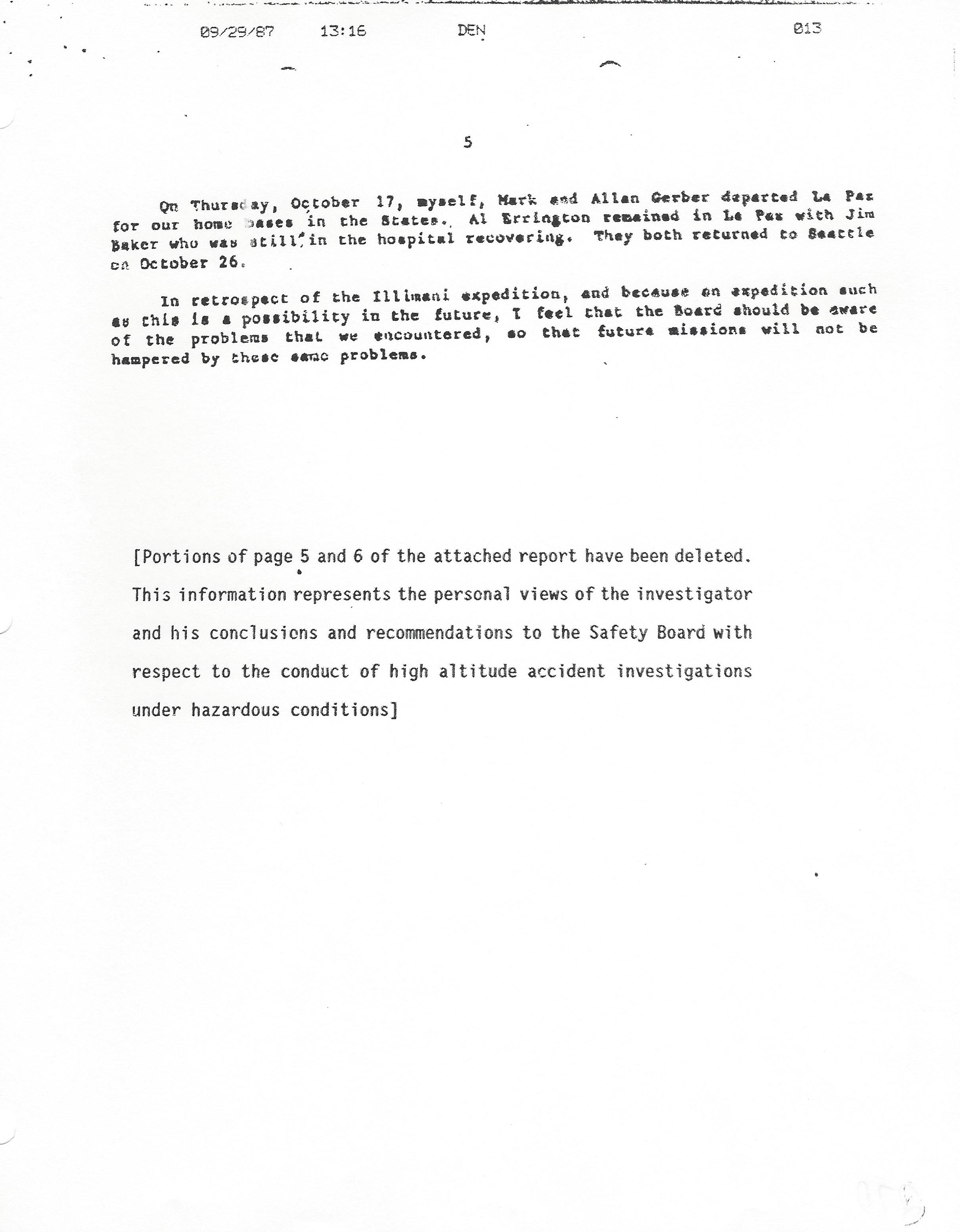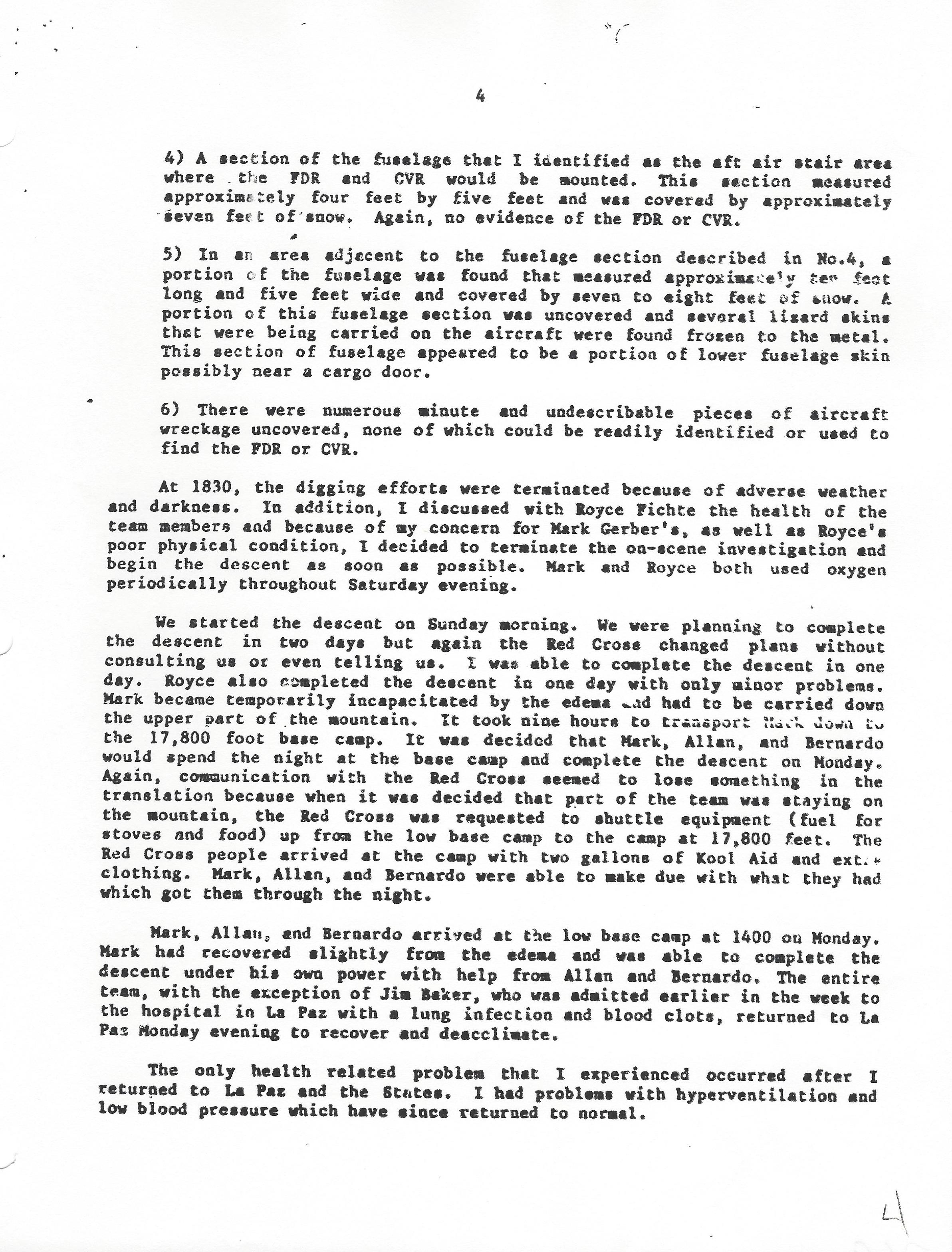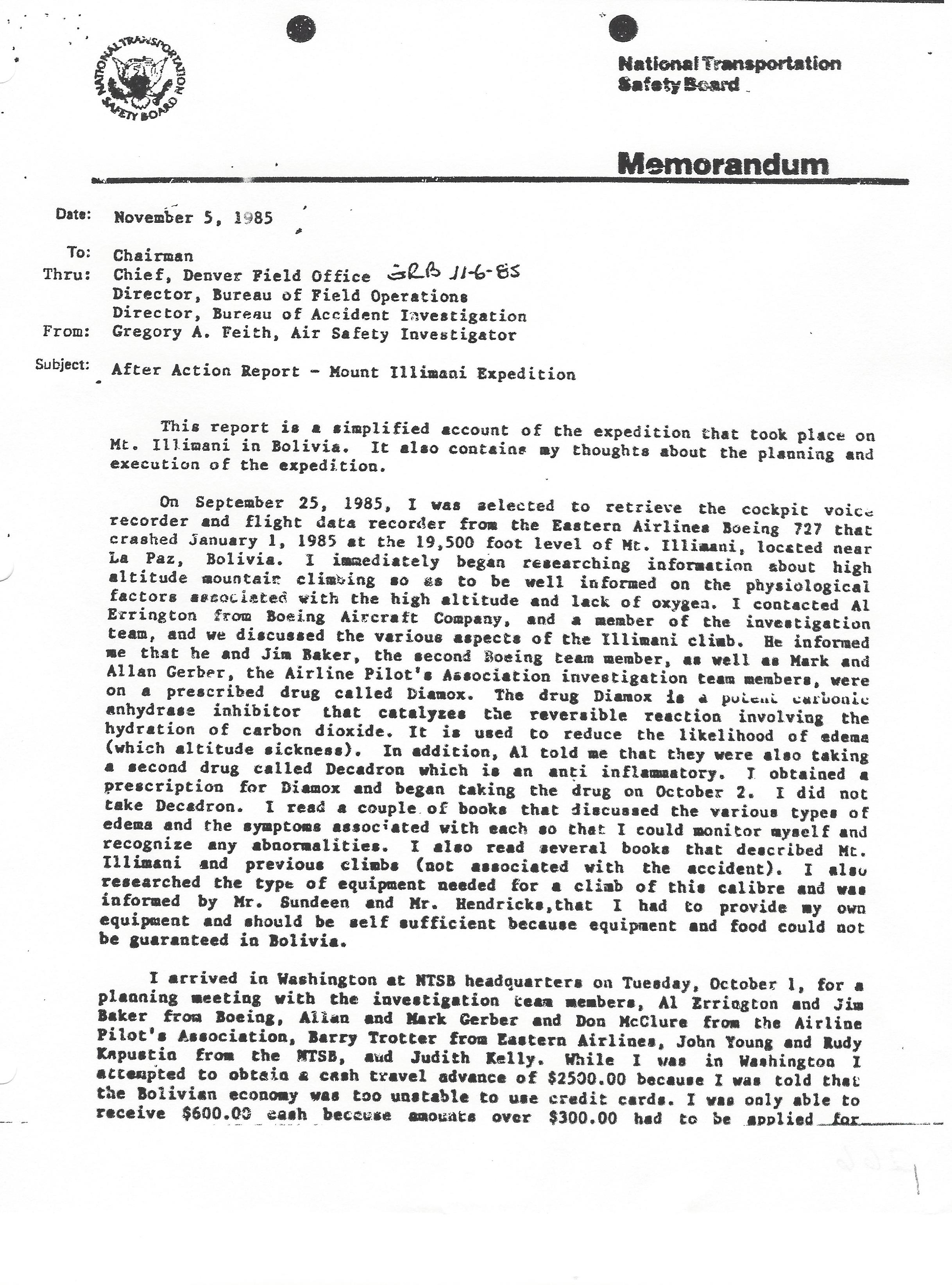 November 5, 1985 Gregory A. Feith, Air Safety Investigator After Action Report – Mount Illimani