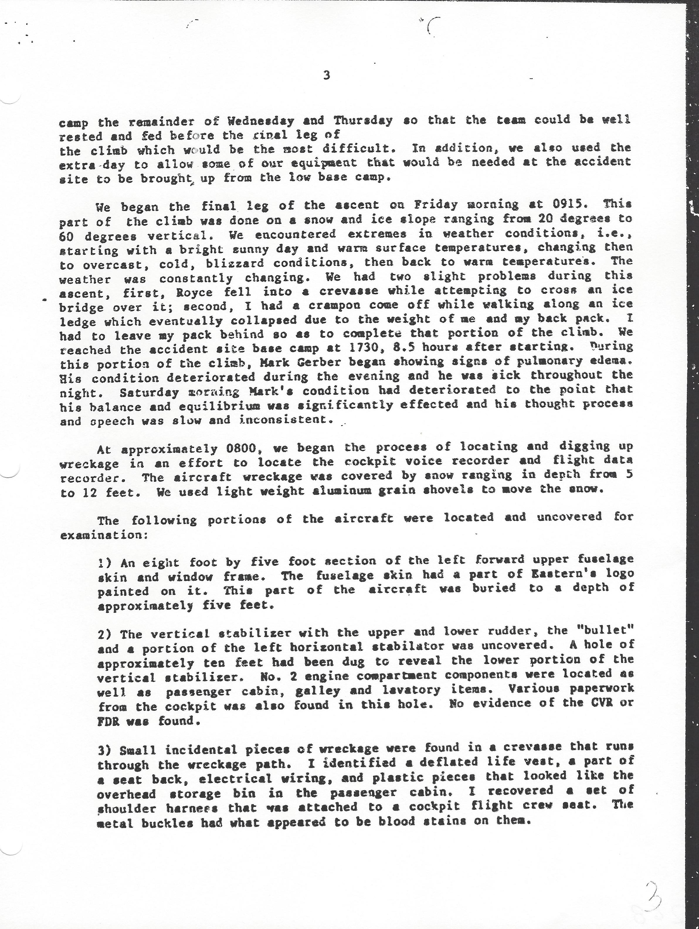 The NTSB Team lead my Air Safety Investigator Gregory A. Feith reached the crash site of Eastern Airlines Flight 980 on Mount Illimani, Bolivia on October 11, 1985 when the aircraft, a Boeing 727, an American Flag Carrier, was covered by 7 to 12 feet of snow.