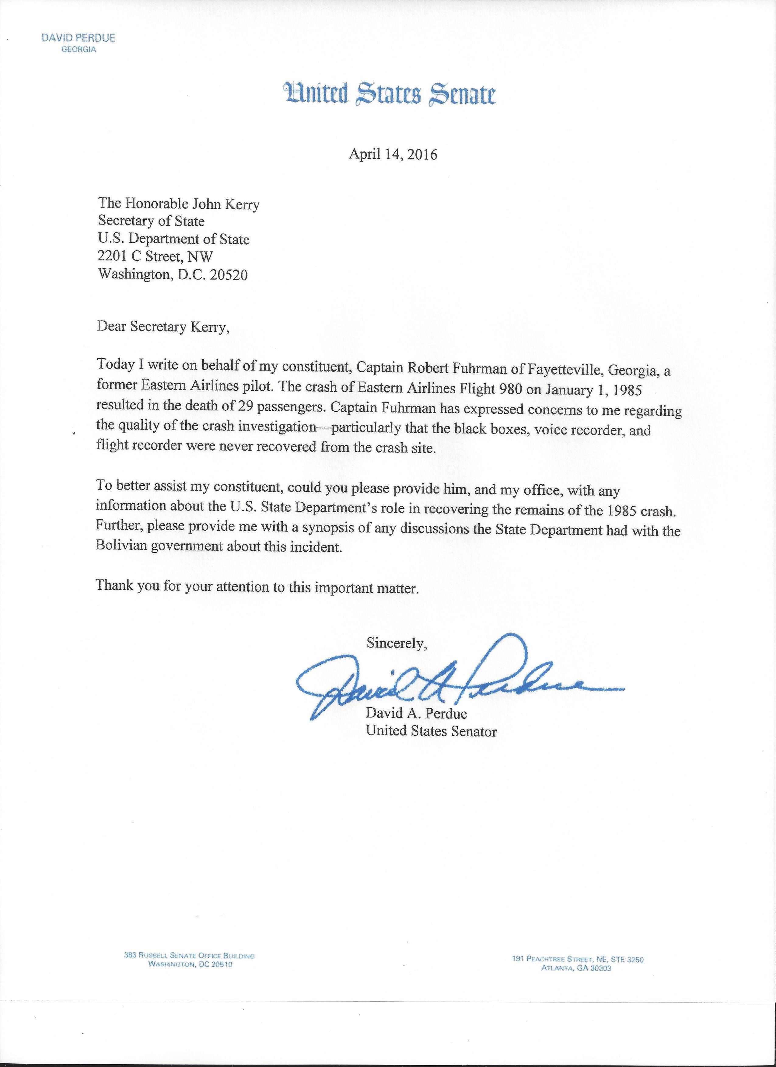 April 14, 2016 Eastern Airlines Flight 980 letter from Senator David Perdue to Secretary of State John Kerry.