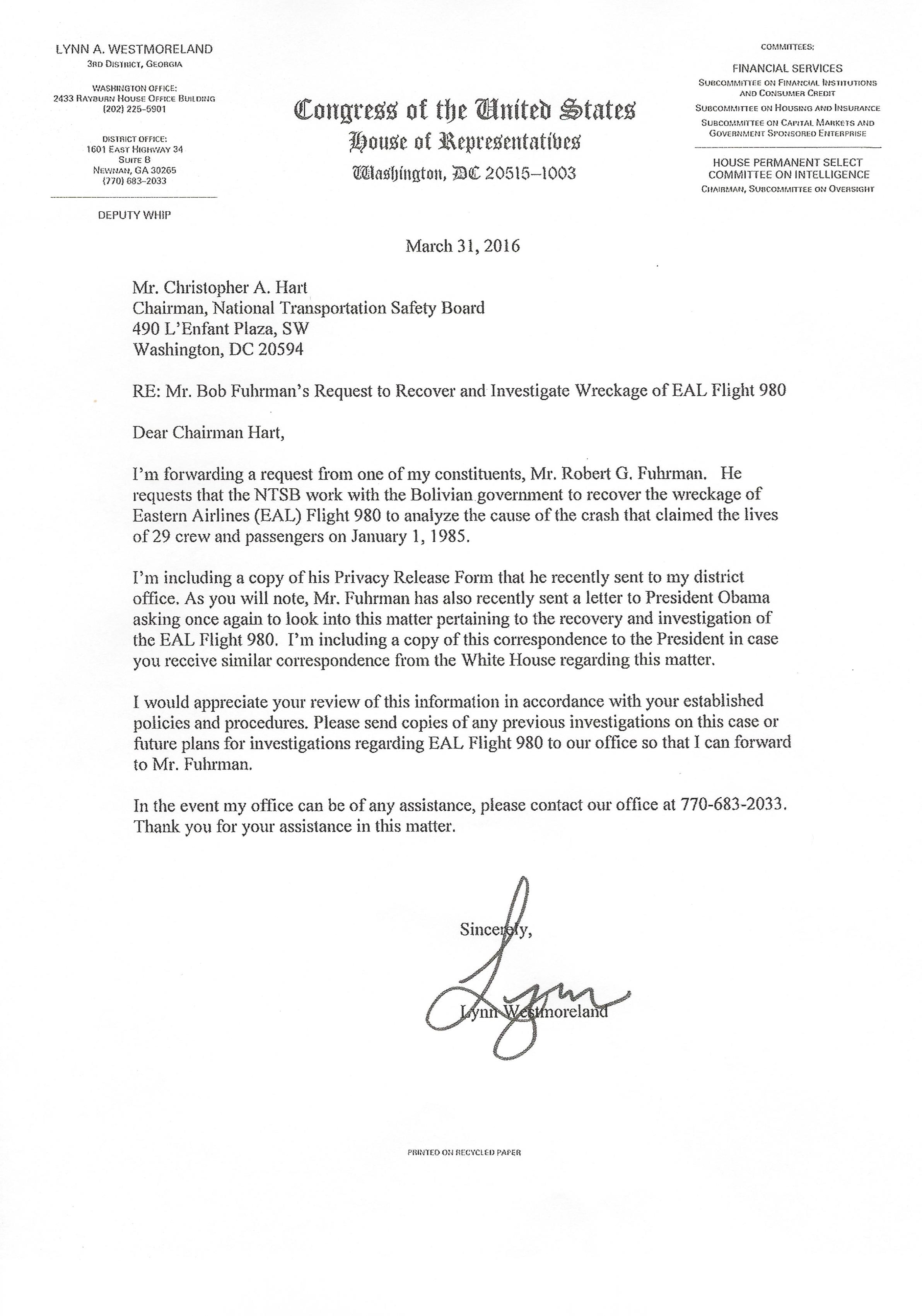 March 31, 2016 letter from Congressman Lynn Westmoreland to the Chairman of the National Transportation Safety Board Christopher A. Hart.