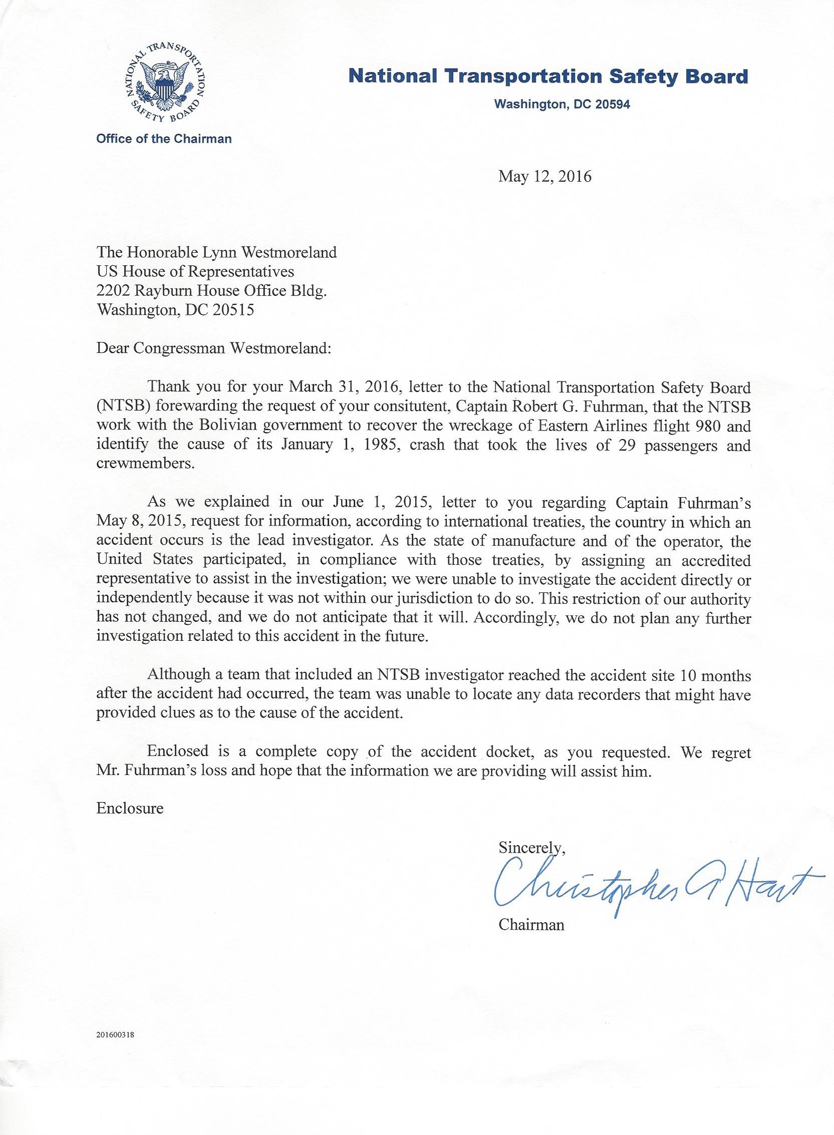 May 12, 2016 letter from the Chairman of the National Transportation Safety Board to Congressman Lynn Westmoreland providing “a complete copy of the accident docket” concerning the Crash of Eastern Airlines Flight 980.