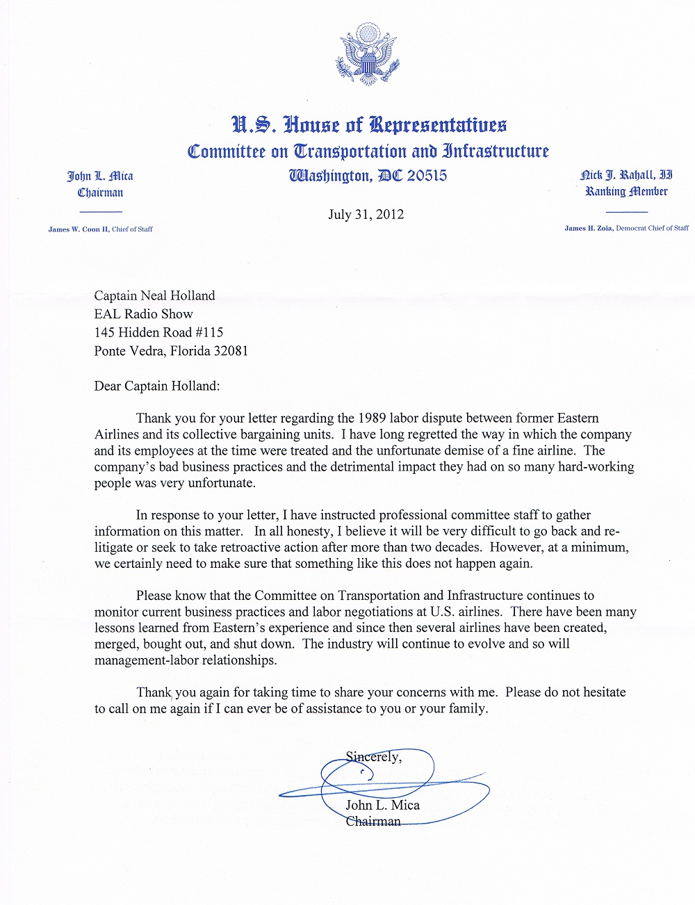 The Families of Eastern Airlines never had a response from Congressman Bill Shuster in relation to having our voices heard before his committee the House Transportation Infrastructure Committee. However, we did receive a letter, dated July 31, 2012, from Congressman John L. Mica, the former Chairman of the House Committee on Transportation and Infrastructure, in his letter to his constituent Eastern Airlines Captain Neal Holland, . Captain Holland, over a period of a year and a half, had written Congressman Mica numerous times and personally visited his local congressional office in Saint Augustine, Florida. Congressman Mica’s response to Captain Neal Holland for the Families of Eastern Airlines is attached below. Please note the reference to the “professional committee staff”, “to gather information on this matter”.