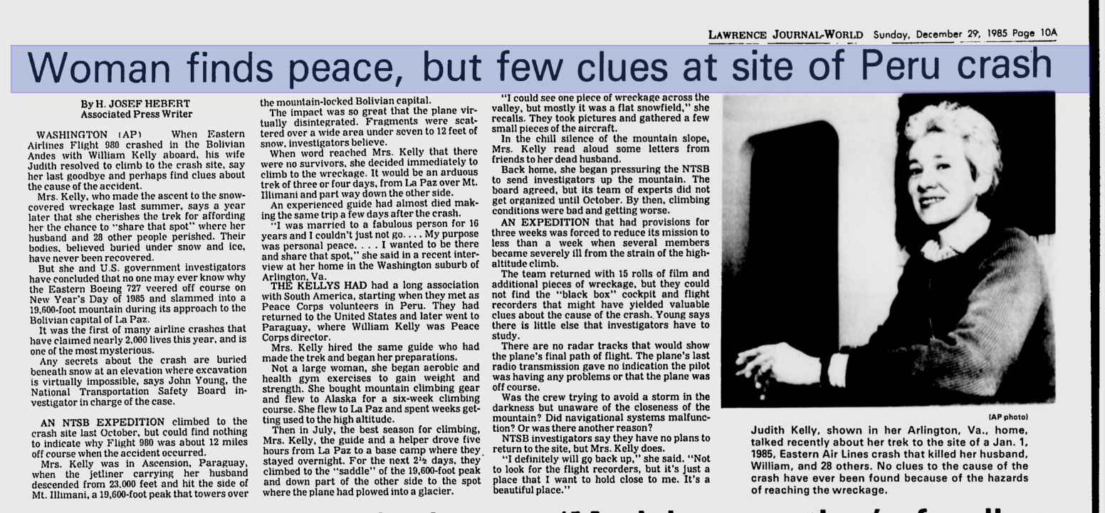 Associated Press – Mrs. Judith Kelly’s resolve to climb Mount Illimani to the Crash Site Of Eastern Airlines Flight 980.